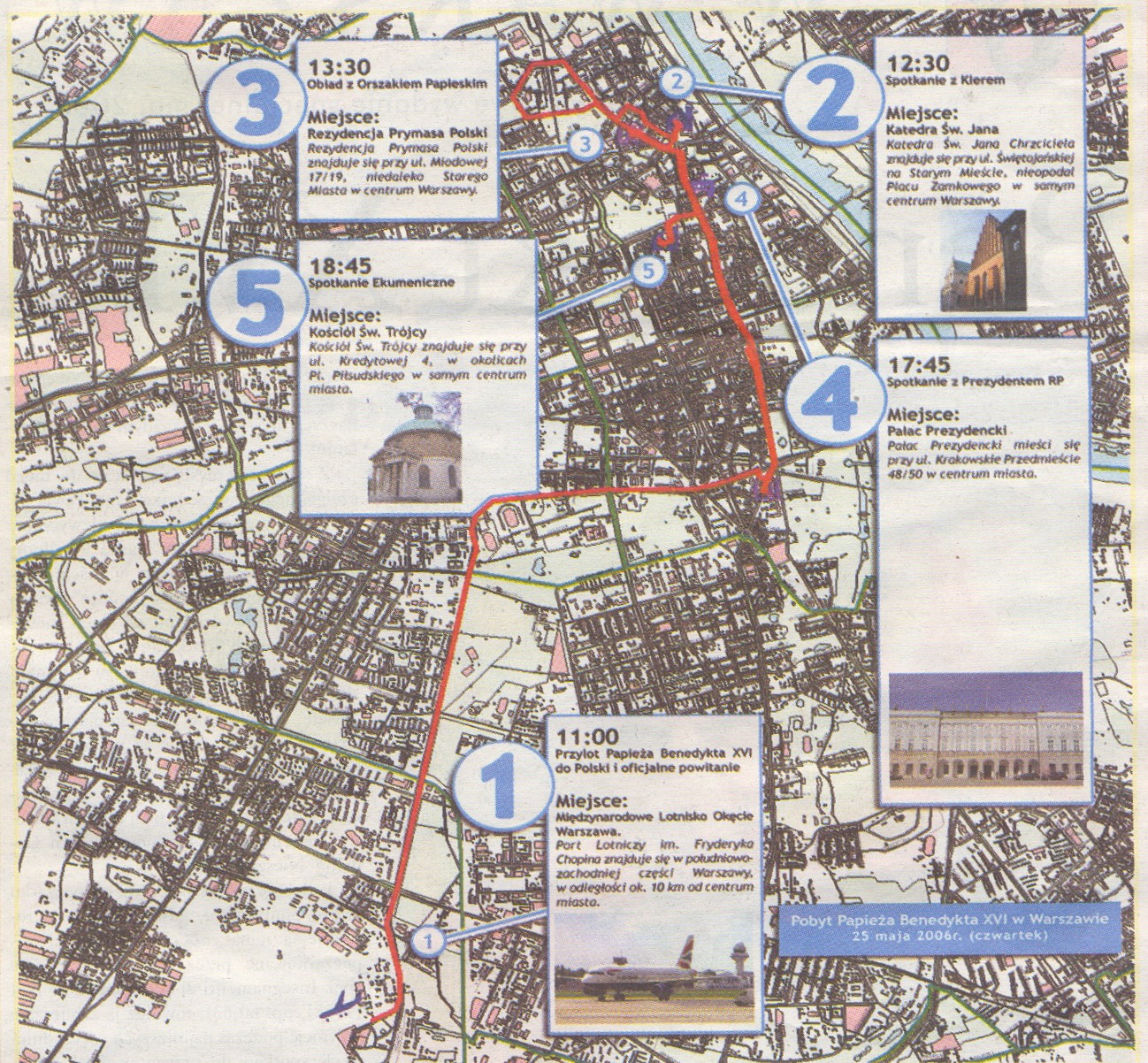 - miłe panie ze straży miejskiej rozdają gazetkę dotyczącą pielgrzymki, drukowaną przez ratusz. A w niej np. taka piękna mapka dla tych, co chcieliby obejrzeć przejazd Papieża (do obejżenia tutaj). No cóż dla osoby znającej Warszawę zupełnie nieczytelna, a dla przyjezdnych… No i na próżno szukałem jakże ważnej informacji o zablokowanych ulicach, trasach objazdów autobusów… Gratulacje